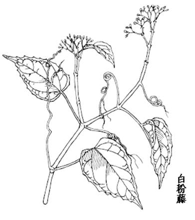 白粉藤是草质藤本,长达数米。卷须二叉状分枝,与叶对生;小枝通常被白粉,枝稍带肉质,绿色,横切面为钝四角形,有纵条纹,干时易在节上脱离。单叶互生;叶柄长4-5cm,无毛;托叶斜菱形,基部楔形;叶片膜质,心状卵形或狭卵形,长5-10cm,先端渐尖,基部心形或截形,边缘有疏锐小锯齿或有时仅3浅裂,上面绿色,平时表面灰绿色,下面浅绿色,两面无毛。花两性,聚伞花序与叶对生,长约3cm,被疏柔毛,少花,第1次分枝呈伞形状;花梗长约3mm,基部常有小苞片;花萼盘状,全缘,外有微柔毛及睫毛;花瓣4,分离;雄蕊4,与花瓣对生;花盘杯状,子房略短于雄蕊,花柱极短,近钻形。浆果肉质,倒卵形或球形,长约6mm,熟时紫色。种子1颗。花期夏、秋季。 |