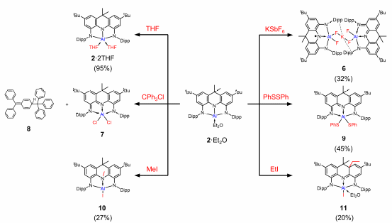 2. 氧化还原反应:在与PhCClPhSSPh以及KSbF6的反应中,配合物展现出基于自由基的单电子转移过程,NNN配体在此过程中可逆地储存和释放电子(图4)。