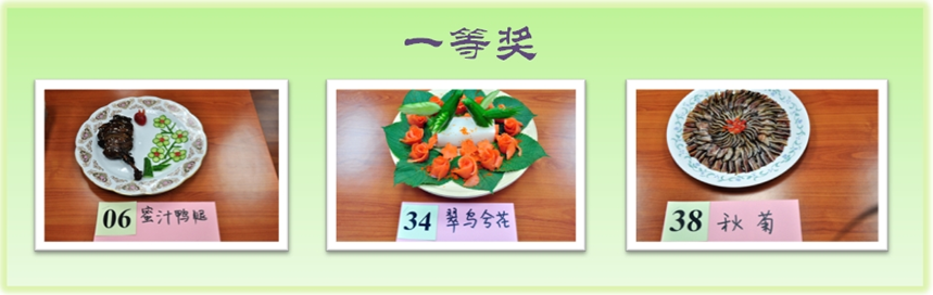 比赛现场,评委和在场的职工拍照的拍照,发微信的发微信,场面非常热闹,已然成为一场“美食嘉年华”。最后,评委们根据成品菜的色泽、造型、口感、创意等方面对参赛作品进行了打分。本次创意冷盘大赛,评出了一等奖3名,分别是6号作品《蜜汁鸭腿》、34号作品《翠鸟兮花》及38号作品《秋菊》,二等奖6名,分别是9号作品《春意盎然》、17号作品《双辉相应》、24号作品《本帮熏鱼》、27号作品《海南风情》、35号作品《雪里红》及36号作品《一品牛腱》,三等奖6名,分别是2号作品《寿司》、10号作品《粉红佳人》、21号作品《春意盎然》、29号作品《国泰民安》、30号作品《十全十美》及37号作品《吉祥孖宝》。