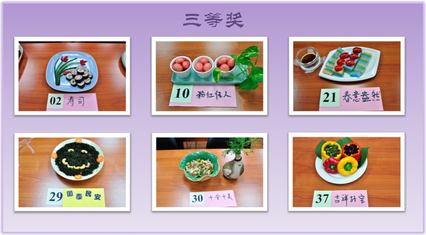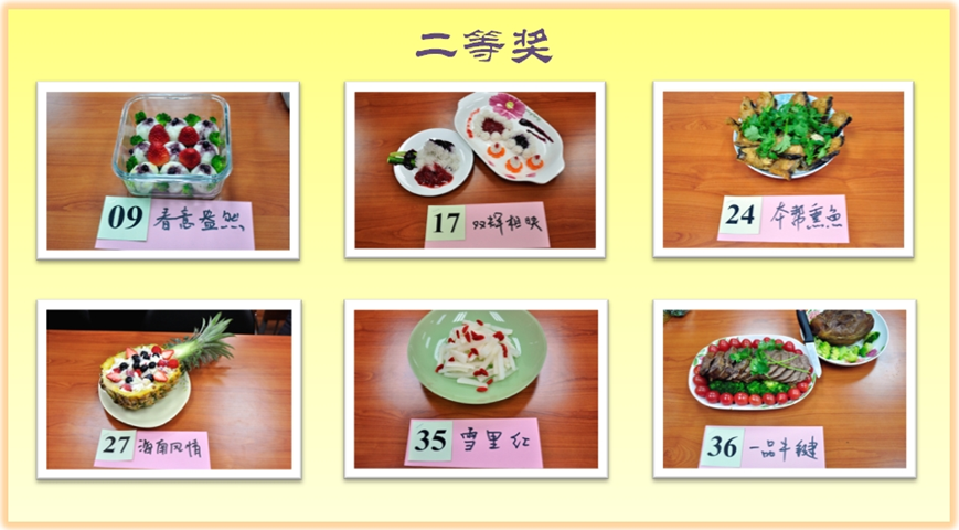 40款创意冷盘作品,款款制作精良,令人回味无穷。本帮熏鱼外层味浓香甜微脆,中间是转折的咸鲜味,最里面的鱼肉仍是白色的,保持了青鱼肉原味和肉质鲜活弹性;作品《翠鸟兮花》,将三文鱼沿着花心根部包卷,顶部往外翻,扮成花瓣的样子,配上用黄瓜雕刻的两只翠鸟,栩栩如生;刀工精湛的《秋菊》,将熏制的猪耳朵切成层层薄片,分三层摆盘成菊花形状;还有外形甜美、爽滑清新的各式水果色拉、土豆泥色拉、山药泥色拉;肉质酥烂、回味无穷的《一品牛腱》、《广式叉烧》、《蜜汁鸭腿》、《糖醋小排》;酸甜爽口的开胃菜,《雪里红》、《粉红佳人》、《吉祥孖宝》;极富创意、摆盘精巧的《鸟巢》、《圣女果之恋》、《兰沐和风》……这些精彩绝伦的冷餐,及色、香、味、形一应俱全,设计巧妙、独具匠心,充分体现出了我们有机所职工对生活的热爱,以及积极、乐观的生活态度。
