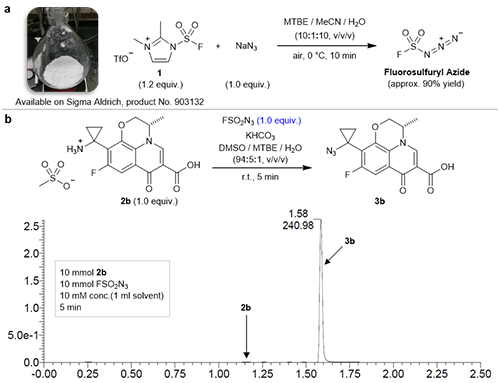 中国科学院上海有机化学研究所有机氟化学重点实验室董佳家研究员课题组在寻找新的SuFEx反应砌块的过程中,意外发现一种安全,高效合成罕见的硫(VI)氟类无机化合物FSO2N3(氟磺酰基叠氮)的方法,他们同时发现该化合物对于一级胺类化合物有极高的重氮转移反应活性和选择性。该成果近日发表于《自然》(nature)。孟根屹,郭太杰,马天成是该文章的共同第一作者,董佳家研究员与K. Barry Sharpless教授为文章的共同通讯作者,上海有机所为本论文的唯一通讯单位。