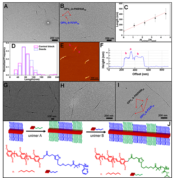 图1. M(OPV5-b-PNIPAM49)-b-M(OPV5-b-P2VP44)--b-M(OPV5-b-PNIPAM49) A-B-A三嵌段纳米纤维的TEM图:(A) nunimer/nseed = (A) 2.26和(B) 4.52。(C) 三嵌段纳米纤维的长度与投料比(nunimer/nseed)的关系图。(D) 三嵌段纳米纤维中间嵌段和所用种子胶束的长度分布图。三嵌段纤维胶束的(E)AFM图以及沿图中红线的(F)高度图。以长度分别为26 nm (G)和177 nm (H)的OPV5-b-P2VP44纤维胶束为种子制备的三嵌段纳米纤维的TEM图。 (J) 利用“种子增长”策略制备A-B-A 和B-A-B-A-B多嵌段纤维胶束示意图。
