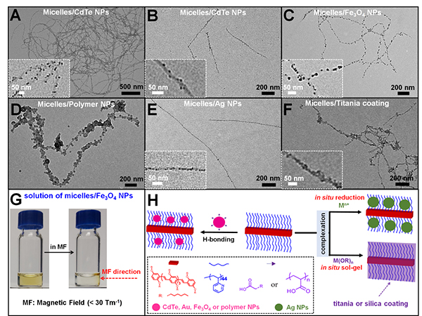 图2. 表面负载有CdTe纳米粒子的长纤维(A)以及长度为766 nm单分散纳米纤维(B)的TEM图;表面负载Fe3O4纳米粒子(C)、聚合物纳米粒子(D)、Ag纳米粒子(E)以及TiO2层(F)的纳米纤维的TEM图。(G)表面负载Fe3O4纳米粒子纳米纤维溶液磁分离前后的照片。(H)以P2VP为锚点负载不同类型纳米粒子的示意图。