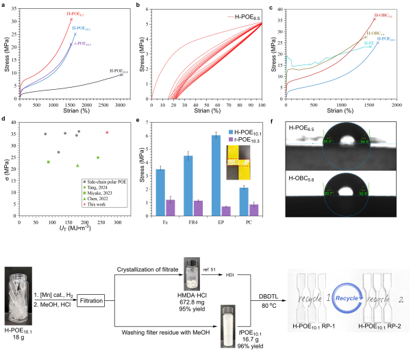 这些极性键不仅增强了分子间作用力,还形成可逆氢键交联网络,从而显著提升了材料的力学性能(图3a-d)。所得聚合物分子量高达120.6 kDa,拉伸强度为30.8 MPa,断裂伸长率超过3000%,同时具备优异的韧性及弹性恢复能力。此外,氨基甲酸酯基团的引入显著增强了材料对金属、环氧树脂等极性基材的粘附性,为其在涂料、结构胶粘剂等领域的应用开辟了前景(图3e)。同时,由该基团参与构建的可逆氢键交联网络,为材料赋予了优异的闭环循环能力。基于锰催化的氢解反应可实现高效回收,回收率超过95%,且再生材料性能得到基本保持(图3g)。