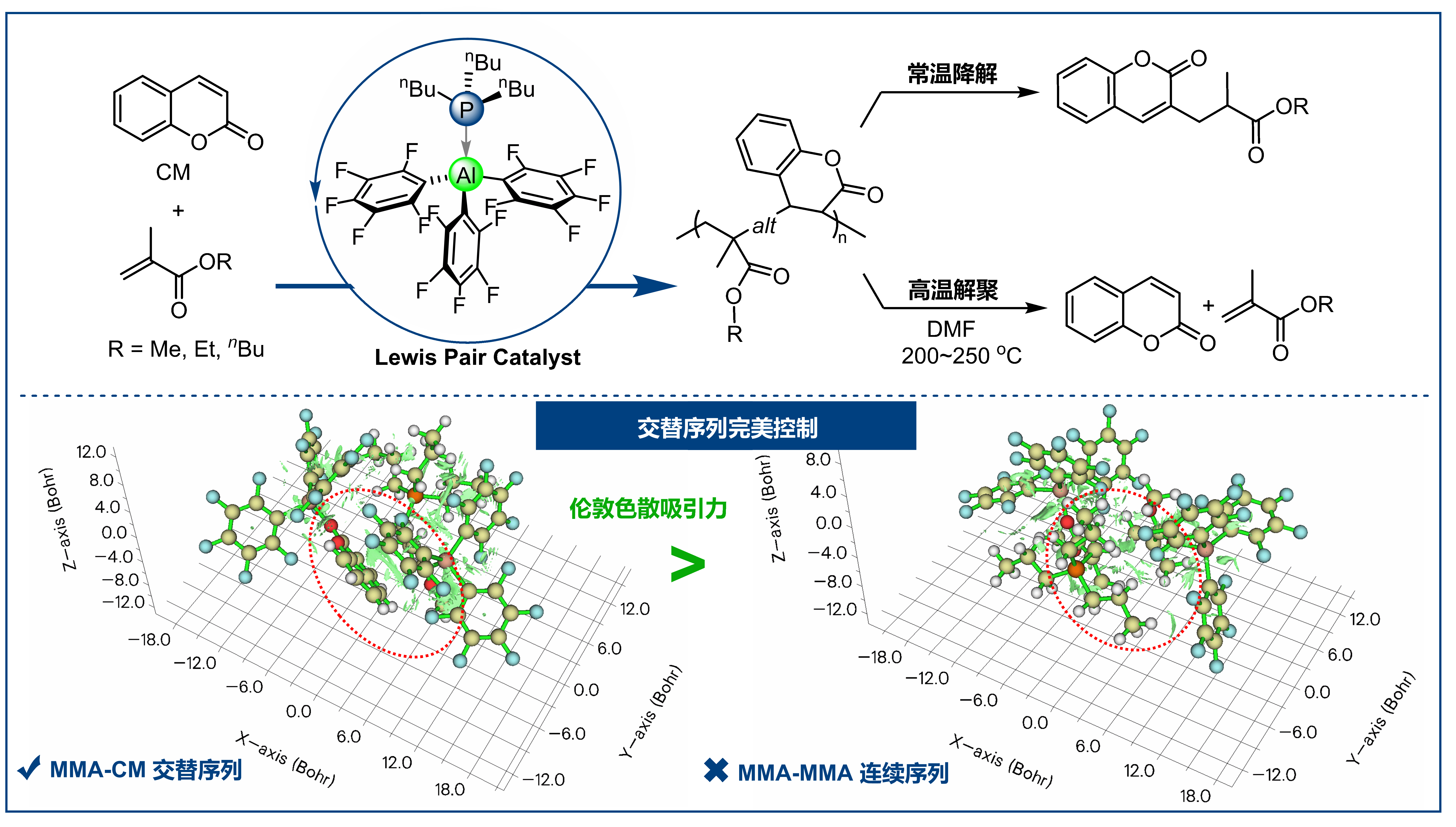 最近,本课题组进一步拓展了ACBC的应用,通过发展Al(C6F5)3/PnBu3路易斯酸碱新催化剂,实现了甲基丙烯酸酯与CM的高效活性共聚,由于甲基丙烯酸酯的位阻比丙烯酸酯大,故需使用超强路易斯酸Al(C6F5)3与小位阻PnBu3,以保障单体的活化与高效引发。所得聚合物具有完美的交替序列控制,不受甲基丙烯酸酯结构及投料比的影响,这与丙烯酸酯共聚体系显著不同(其需过量CM才可实现高但不完美的交替度)。理论计算表明:该体系为动力学控制(图1),生成MMA-CM交替序列的能垒远低于MMA-MMA连续序列(MMA: 甲基丙烯酸甲酯),该反常的动力学优势源自于催化剂与CM之间的伦敦色散吸引力高于MMA;这种通过催化剂控制交替序列的机制与文献中单体电子给/受体调控策略完全不同,为乙烯基单体的交替序列控制提供了新方法。受益于交替序列控制,合成得到的高透明、高耐热性C-C主链聚合物(Tg: 130-190 oC, Td up to 300 oC)亦可通过ACBC实现常温定量降解,并可在强给电子溶剂(如DMF)存在下,实现高温定量解聚,进而回收单体。在可降解/解聚的同时,这种C-C主链聚合物还兼具优异的耐久性,常温储存6个月、紫外照射24小时、高温高湿100小时(80 °C,50%湿度)均保持稳定,突破了以往可持续性高分子材料通常面临“可降解/解聚性”与“耐久性”无法兼顾的挑战。