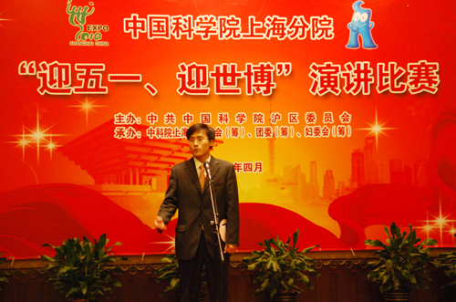 2010年4月29日下午中科院上海分院在上海学术活动中心举行了以“科技与世博”为主题的“迎五一、迎世博”演讲比赛。上海有机所党委书记郏静芳作为评委出席了此次演讲比赛。来自上海分院系统各个研究院所的20名选手参加了这次比赛。经过激烈的角逐,评选出一等奖1名,二等奖3名,三等奖5名。上海有机所研究生张延和职工陈铭代表有机所参加了比赛,展现了有机所科技青年的风采,也体现了有机所青年参与世博的热情。