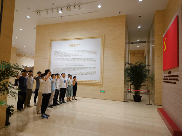纪念馆分为序厅、“前仆后继 救亡图存”、“民众觉醒 主义抉择”、“早期组织 星火初燃”、“开天辟地 日出东方”、“砥砺前行 光辉历程”和尾厅7大板块,通过详细文字介绍,珍贵文物展出,雕塑实景还原以及多媒体影像等多种方式,生动展示了仁人志士救亡图存的探索和中国共产党的诞生历程。其中展示了党的早期活动者在以《新青年》为代表的进步期刊上发表的文章,集中展现马克思主义与当时其他新潮思想的争论碰撞。关于中国的未来究竟要走什么道路这一重要问题,从理论到后来的实践,都证明马克思主义是正确的,是符合国情民情的。最后在纪念馆的宣誓厅内,面对庄严的中国共产党党旗,支部党员们举起右拳,重温了党誓词。