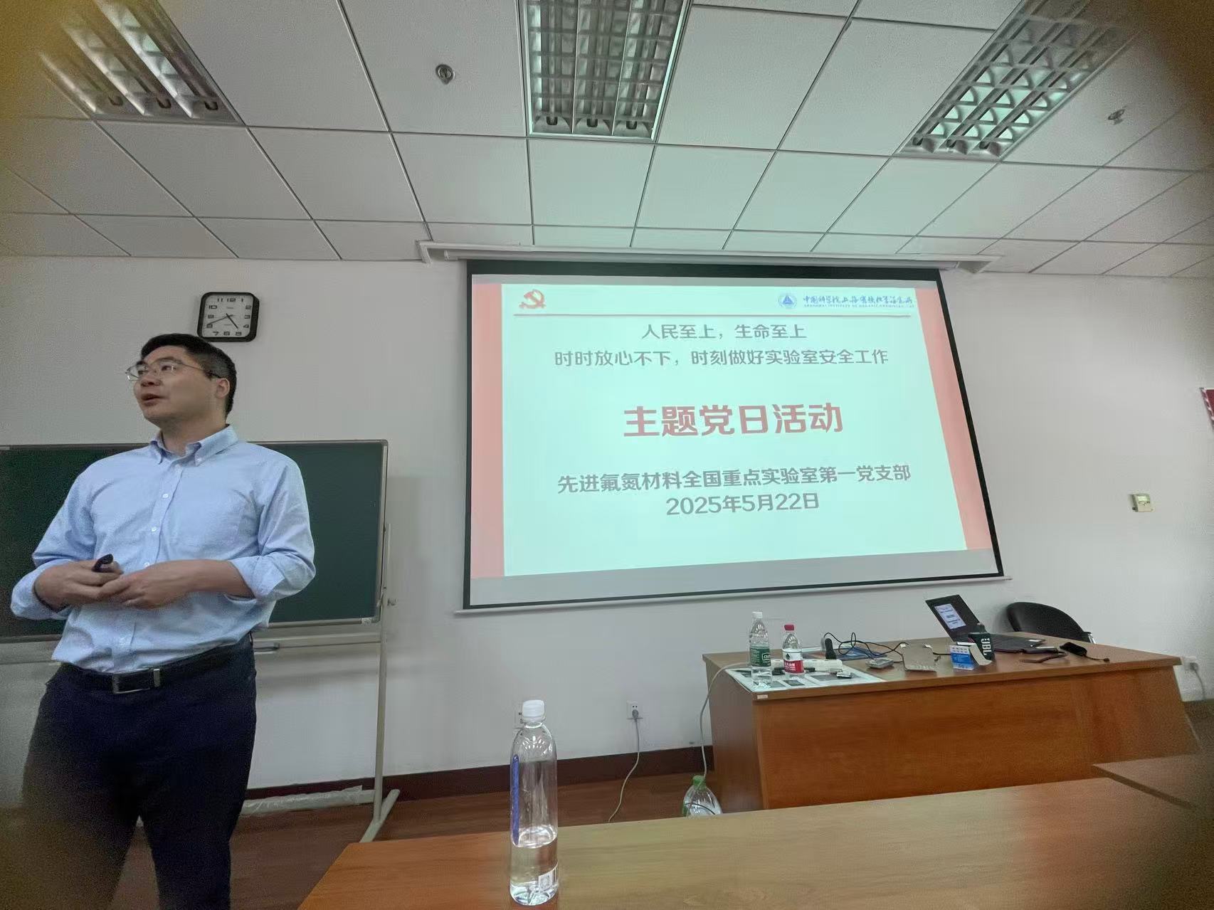 2025年5月22日,中国科学院上海有机化学研究所先进氟氮材料全国重点实验室第一党支部在2号楼第二教室开展了 “人民至上、生命至上,时时放心不下,时刻做好实验室安全工作”主题党日活动。上海有机所所长、党委书记胡金波以普通党员身份参加活动,所党委委员、副所长刘菲列席活动,会议由支部书记张新刚主持。