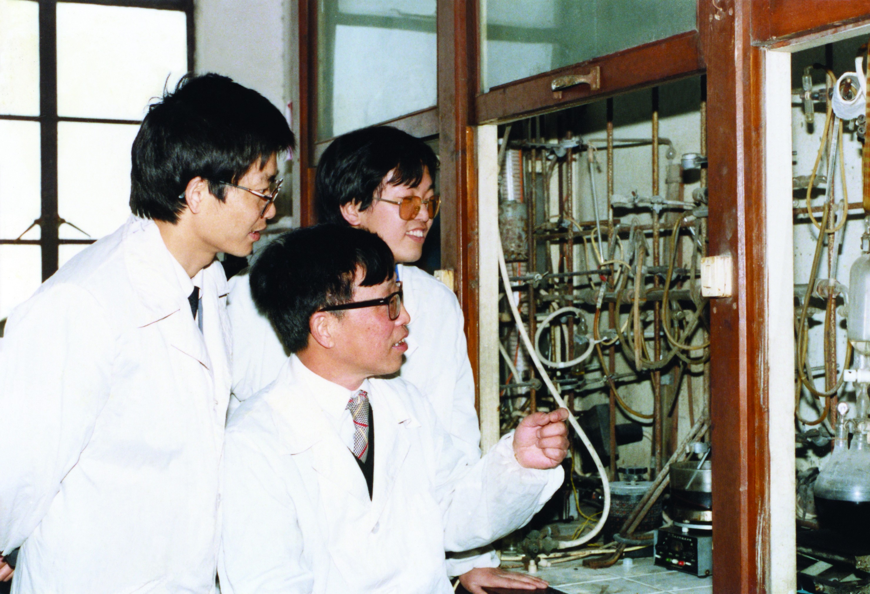 1985年与研究生一起研究反应过程的照片