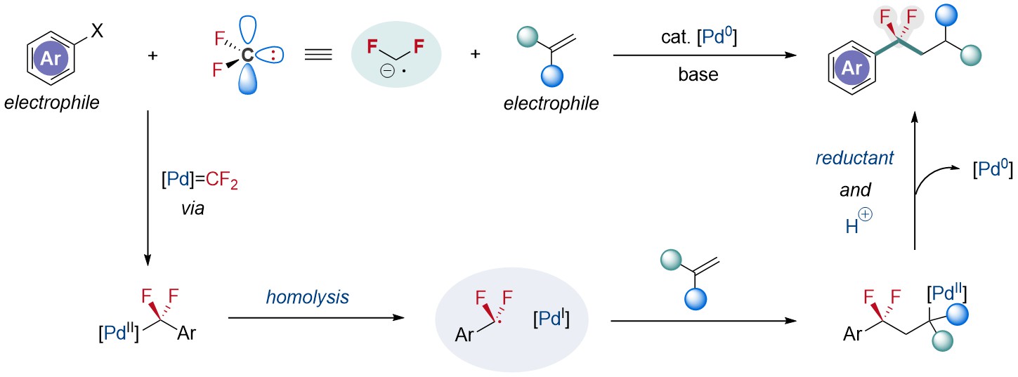 最近,中国科学院上海有机化学研究所先进氟氮材料全国重点实验室的张新刚课题组报道了一种热均裂解锁二氟卡宾成为氟碳自由基的新机制,同时首次提出了含氟碳基活性中间体统一性概念(UFAI),其中计算部分由上海有机所的薛小松课题组完成。该研究工作通过芳基二氟甲基钯物种的热均裂,成功将二氟卡宾转化为二氟烷基自由基,实现了其作为氟碳负离子与氟碳自由基的双重功能,突破了二氟卡宾由于其基态单线态与激发态三线态之间存在高能垒(57 kcal/mol),很难使二氟卡宾变为自由基的挑战。该研究同时表明,金属二氟卡宾物种可以作为一个核心平台,使二氟卡宾拥有亲核、亲电和自由基的反应特性,进而可以完成形式上对含氟碳基活性中间体的统一,从而为含氟有机化合物的高效精准合成提供了一种全新思维。