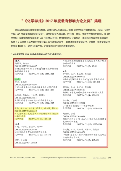 祝贺荣健博士的论文荣获“《化学学报》2017 年度最有影响力论文奖”!