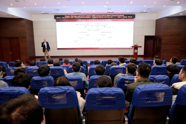 Stahl教授的报告从自然界中生物利用氧气实现氧化反应的角度切入,系统阐述了氧气参与的催化氧化转化:详细介绍过电位等电化学基本概念在设计有机反应中的应用;通过使用媒介降低反应的过电位,从而使氧气参与的氧化反应更易进行;并进一步引申到氢阳极实现的电化学合成还原偶联反应及其在工业化中的初步应用。精彩的报告内容开阔了同学们科研思路和视野,提高了解决具体科学问题能力。报告结束后,在场师生们意犹未尽,与Stahl教授进行热烈讨论。