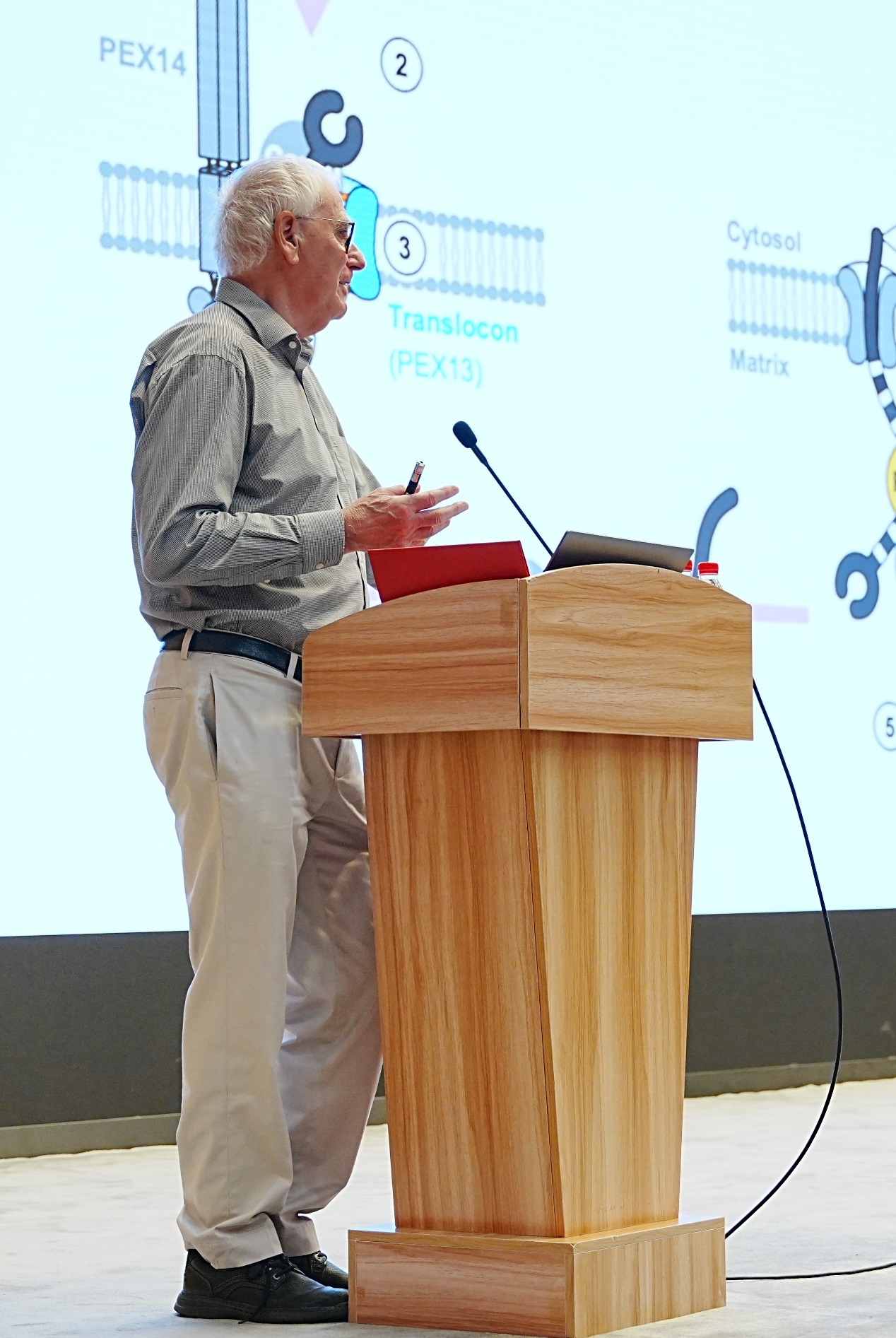 Tom A. Rapoport教授的报告着重讲解了他的团队在蛋白质运输进入和移出过氧化物酶体等方面的前沿研究进展。Rapoport教授发展了全新的体外研究方法,利用其发现的通道蛋白Pex13在体外行成凝胶状物质的特性,研究了蛋白质底物渗透进入凝胶介质的分子机理。此外,Rapoport教授解析了过氧化物酶体关键泛素连接酶复合物的结构,发现其构成了物质离开过氧化物酶体的关键通道,阐明了其分子机制并解释了其与疾病的关系。