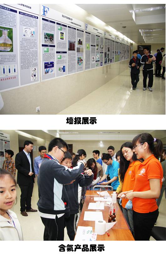 展厅内气氛活跃而热烈,参观者们踊跃提问,志愿者们耐心讲解,实现了良好的互动。趣味化学小实验吸引了很多小朋友的目光,志愿者们在满足他们的好奇心后,更是以通俗易懂的语言讲解其中的原因,增加他们对氟化学的兴趣。而社区居民朋友们对与人类生活息息相关的氟化学知识更感兴趣,志愿者们向他们介绍了含氟牙膏的作用及注意事项等。