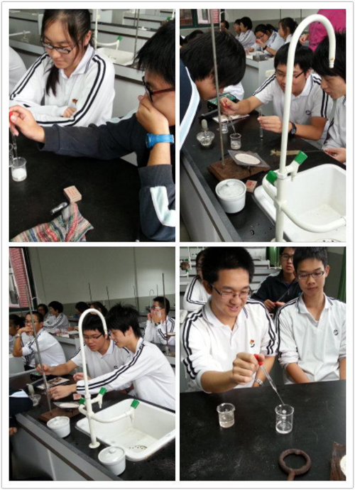 随后,付文振和刘国都向同学们演示了一个化学趣味实验——结晶醋酸钠的制备。付文振首先将无水碳酸钠加入到热水中,搅拌溶解,配成饱和碳酸钠溶液;刘国都博士用滴管向饱和碳酸钠溶液中缓缓滴加冰醋酸,大量气泡随之产生,继续滴加冰醋酸,溶液上层逐步析出白色固体。明显的实验现象引起了在座同学们的浓厚兴趣,纷纷自己动手操作,“为什么会出现这个现象呢?”同学们脸上流露出疑问的表情。刘国都博士向同学们解释了为什么会既有气泡产生又有沉淀生成,主要是因为醋酸和碳酸钠发生酸碱反应生成二氧化碳和醋酸钠,观察到大量气泡就是反应产生的二氧化碳;随着反应的继续,生成了大量的醋酸钠,超过了其在水中的溶解度,便吸水后生成三水合醋酸钠晶体析出。听完刘博士的讲解,学生们终于解开了心中的疑问。