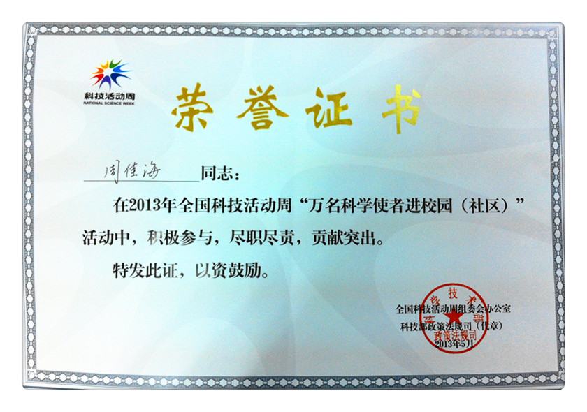 2013年5月18日,上海有机所周佳海研究员在全国科技周活动中作题为“生命中的化学”的科普报告。因贡献突出,获2013年全国科技活动周荣誉证书。
