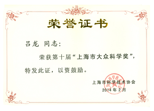 吕龙研究员多年来在承担繁重的科研工作之余,以其满腔热情积极投身于化学及相关学科的科普工作中,经常深入高校及中小学为师生做科普报告,指导学生课外科技活动;在上海市干部培训中心、上海科普大讲坛等开设科普讲座,形式新颖,如以“化学秀”形式开展的“我们身边的绿色科学”讲座等;组织市化学化工学会开展上海市青少年“白猫杯”应用化学与技能竞赛,参与组织中国化学会举办的全国高中学生化学竞赛等。2011年荣获“上海科普大讲坛科普宣讲大使”,2012年荣获“上海科技活动周先进个人”、“2007-2011年度上海市学习型社会建设与终身教育工作先进个人”等称号。