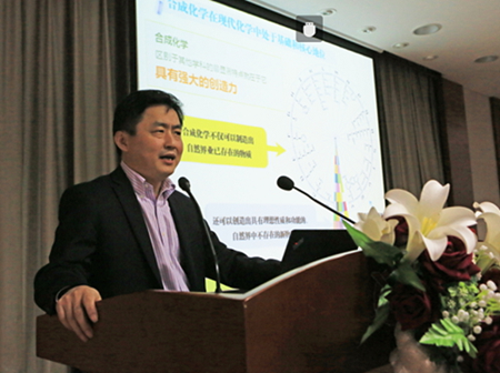 前来授课的中科院院士,中科院上海有机化学所所长丁奎岭以平实的语言,从合成化学与人类健康、生命科学、现代农业、材料科学方面阐述了世界科技变革给我们生活带来的改变。其中不乏许多如青霉素发现及改造、合成氨的发现、水立方外表合成材料等鲜活的例子,引起了刚接触化学不久的高一同学的兴趣与共鸣。在讲座接近尾声的阶段,丁院士又提出了当今合成化学面临的挑战和机遇,鼓励广大同学了解化学,争取未来在合成化学中用自己的智慧为中国、为人类作出贡献。
