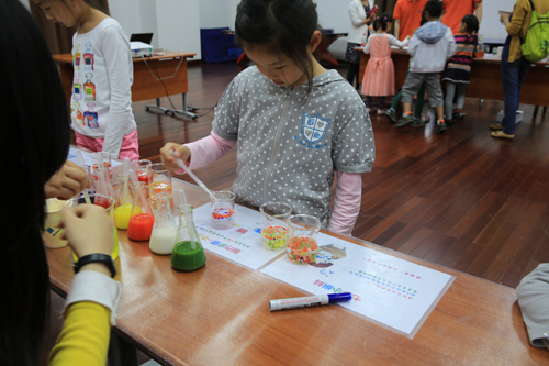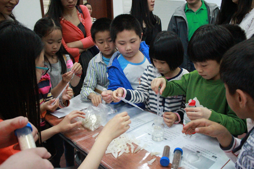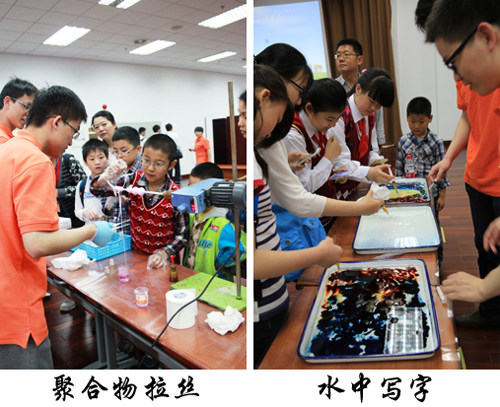 展厅内,志愿者们精心准备了5个趣味实验展示:聚合物拉丝、水中写字、硼砂果冻、五彩小蝌蚪、维C之奥秘。