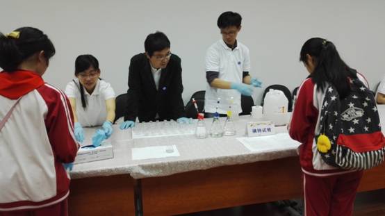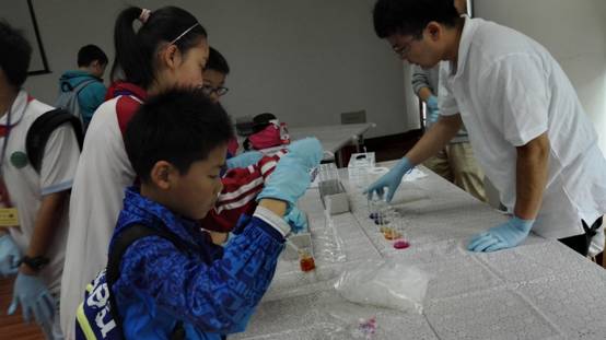 殷亮课题组展示了见风使舵千般色实验。利用不同浓度的酸、碱和百里酚蓝溶液混合可分别观察到无色溶液变为红色、橙色、黄色、蓝黑色、蓝色一系列的颜色变化。多彩的颜色变化使得小朋友们都纷纷上手,自己操作,并仔细观察各种不同的颜色变化。