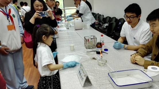 田伟生课题组展示了魔棒点灯实验。取少量高锰酸钾晶体放在表面皿(或玻璃片)上,在高锰酸钾上滴2、3滴浓硫酸,用玻璃棒蘸取后,去接触酒精灯的灯芯,灯芯就会被点燃。这个反应的原理是利用浓硫酸与高锰酸钾反应生成氧化性很强的七氧化二锰。七氧化二锰和乙醇剧烈反应放出大量热,从而将醇等点燃温度达到可燃物的着火点就可以点着。小朋友们纷纷上手都来试这种不用火材、打火机就能点火的实验。