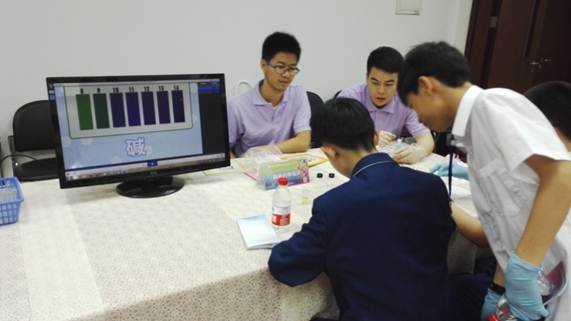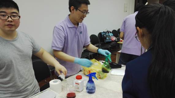 最让志愿者闲不住的实验是“指纹检查”。夹试管,放纸片,放碘粒,盖试管,加热,解释。这些动作大部分要由志愿者协助甚至亲自完成,而且要不厌其烦地重复这“一遍一遍的慢动作”,这也考验了他们的耐心。