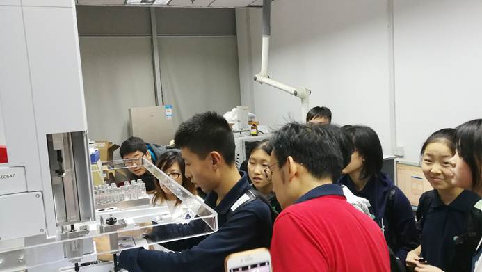 接着,进入了现场参观及动手环节。王博士带领同学们参观了有机所的公共技术服务中心,介绍了各个仪器,几名同学还亲自动手,参与配样、进样以及波谱分析,个个兴奋不已。有了这种直观的感受同学们可以近一步了解各种质谱、色谱仪器,以及了解对化合物进行质谱定性、定量分析的方法。