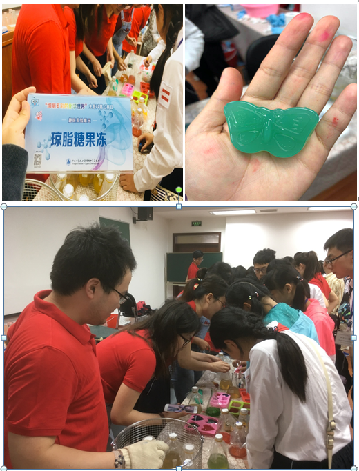 周佳海课题组展示了“琼脂糖果冻”的制备。琼脂糖是一种由糖类物质组成的线性多聚物,琼脂果胶是由许多更小的分子组成的异质混合物。“琼脂糖果冻”实验使用琼脂糖制备琼脂果胶,琼脂糖在水中加热到90℃以上溶解,温度下降到35-40℃时可以形成良好的半固体状凝胶,在室温下继续放置一段时间即可定型。在琼脂糖溶液中加入不同颜色的色素,就可以做成不同颜色的“琼脂糖果冻”。 在了解实验原理之后,同学们纷纷自己动手,制成了各种颜色各种形状的成品。
