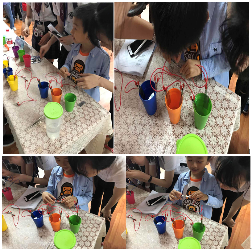 房鹏飞课题组做了自来水发电的科普实验。在自来水中加入食盐后,发光二极管会比原先更亮。小朋友们通过自己动手连接自来水电池,点亮二极管,体会到了化学与生活密不可分。