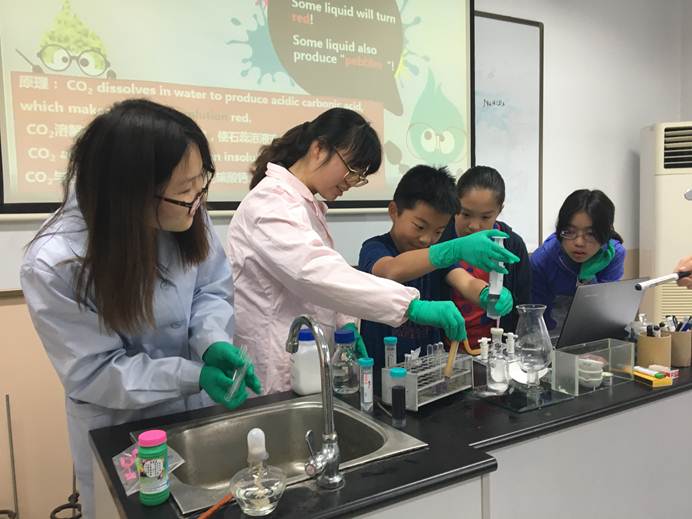4月15日,酷炫化学小分队科普志愿者马小舒、陈金凤和蔡毓娟来到上中国际部,带着五年级和六年级的同学们一起玩转二氧化碳。