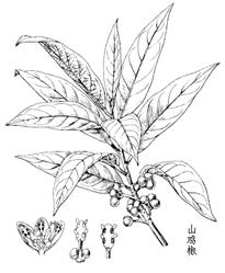 山鸡椒是落叶灌木或小乔木,高可达10m。叶和果实有芳香气。根圆锥形,灰白色;幼树树皮黄绿色,光滑,老树树皮灰褐色。叶芽无鳞片;幼枝细长,被绢毛。叶膜质,互生;叶柄细弱,长1-2cm;叶片披针形或长椭圆形,长4-11cm,宽1.2-2.5cm,先端渐尖,基部楔形,全缘,上面深绿色,下面苍白绿色,两面均无毛,羽状脉,侧脉每边6-10条,纤细,中脉、侧脉在两面均突起。花先叶开放,雌雄异株;伞形花序单生或簇生,总花梗纤细,长5-10mm,总苞片4,上有4-6朵小花,淡黄色;花被裂片6,倒卵圆形;能育雄蕊9,排成3轮,第3轮基部的腺体具短柄。雌花中退化雄蕊多数,子房卵形,花柱短,柱头头状。浆果状核果近球形,直径4-5mm,无毛,幼时绿色,成熟时黑色;果梗长2-4mm。花期2-4月,果期6-8月。 |
