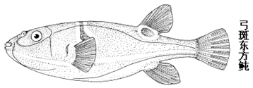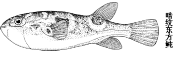 ③暗纹东方鲀:本种与弓斑东方鲀的区别是:棕褐色,背侧面具不明显的暗褐色横纹4-6条,横纹之间白色狭纹3-5条。胸鳍后上方体侧处具一圆形黑色大斑,边缘白色。