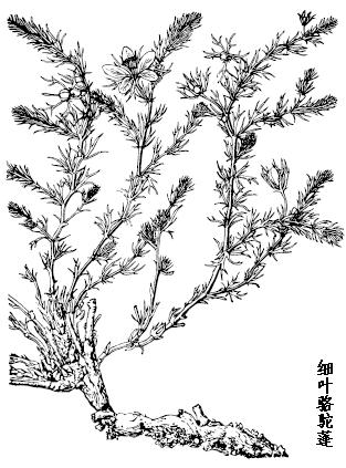化合物成分:消旋骆驼蓬碱(dl-peganine)、去氧骆驼蓬碱(deoxypeganine)、鸭嘴花酮碱(vasicinone)、去氧鸭嘴花酮碱(deoxyvasicinone)、哈尔明碱(harmine)、哈尔明碱和哈尔马灵碱(harmaline)、挥发油(以脂肪族化合物为主,含量较高的十六烷酸(dexadecanoic acid),1-辛烯-3-醇(1-细叶骆驼蓬octene-3-ol),12-十七碳炔醇-1(12-heptadecayn-1-ol))。