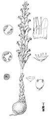 丁座草是寄生草本。高15-45cm,近无毛。根茎球形或近球形,直径2-5cm,常仅有一条直立的茎。茎不分枝,肉质,圆柱状,褐色。叶宽三角形、三角状卵形至卵形,长1-2cm,宽0.6-1.2cm。总状花序,长8-20cm,花多密集;苞片1枚,三角状卵形;小苞片无或2枚,早落或宿存,线状披针形;花梗长6-10mm,花序上部渐变短;花萼浅杯状,先端5裂,裂片不等长,裂片花后部分或全部脱落,仅筒部宿存;花冠唇形,黄褐色或淡紫色,筒部稍膨大,上唇盔状,下唇远短于上唇,3浅裂,裂片三角形或狭长圆形,常反折;雄蕊4,花丝着生于距筒基部4-6mm处,常伸出于花冠之外,花药卵状长圆形;雌蕊由2(稀3)心皮组成;子房长圆形,花柱长约1cm,柱头盘状,常3浅裂。蒴果近圆球形或卵状长圆形,长1.5-2.2cm,直径1-1.5cm,常3瓣开裂。种子不规则球形。花期4-6月,果期6-9月。