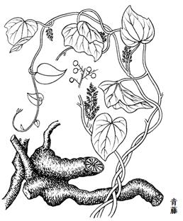 化合物成分:青风藤碱(sinoacutine),尖防己碱(acutumine),N-去甲尖防己碱(N-acutumidine),白兰花碱(michelalbine),光千金藤碱(stepharine),青藤碱(sinomerine),双青藤碱(disinomenine),木兰花碱(magnoflorine),四氢表小檗碱(sinactine),异青藤碱(isosinomenine),土藤碱(tuduranine),豆甾醇(stigmasterol),β-谷甾醇(β-sitosterol),消旋丁香树脂酚(syringaresinol)以及十六烷酸甲酯(methyl palmitate)。