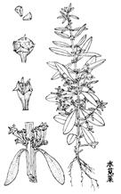 水苋菜是一年生草本,无毛,高10-50cm。茎直立,多分枝,带淡紫色,稍呈4棱,有狭翅。叶近于无柄;生于下部的对生,生于上部或侧枝上的略成互生;叶片长椭圆形,披针形或倒披针形,生于茎上部的长达7cm,生于侧枝上的较小,长6-15mm,宽3-5mm,先端短尖或钝形,基部渐狭,侧脉不明显。聚伞花序腋生,花较密集,花梗长1.5mm,几无总花梗,花极小,绿色或淡紫色;花萼蕾期钟形,萼齿4,正三角形,果期半球形,包围蒴果下半部;通常无花瓣;雄蕊通常4,贴生于萼筒中部,与花萼裂片等长或较短;子房球形,花柱极短或无花柱。蒴果球形,紫红色,直径1-1.5mm,中部以上不规则周裂。种子多数,极小,近三角形,黑色。花期8-10月,果期9-12月。
