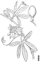 西番莲是多年生草质藤本。茎圆柱形,略具棱槽,有多数分枝,老枝常带紫红色;卷须腋生,长13-17cm。叶互生;叶柄长2-3cm;中部散生2-6个小腺体;托叶较大,肾形,抱茎;叶掌状5深裂,长5-7cm,宽6-8cm,裂片长椭圆形,中央的较大,两侧的略小,全缘。单花腋生,花大,直径6-10cm,淡绿色;苞片3,宽卵形;萼片5,背面近先端有一角状物;花瓣5,长圆状披针形,与萼片近等长;副花冠裂片3轮,丝状,白色,上下两端带蓝色或紫红色;内花冠流苏状,紫红色,其下具花盘;雄蕊5,花丝基部与子房柄合生;子房卵圆形,花柱3,紫红色。浆果卵形或近球形,熟时黄色。种子多数,有红色假种皮。花期5-7月。
