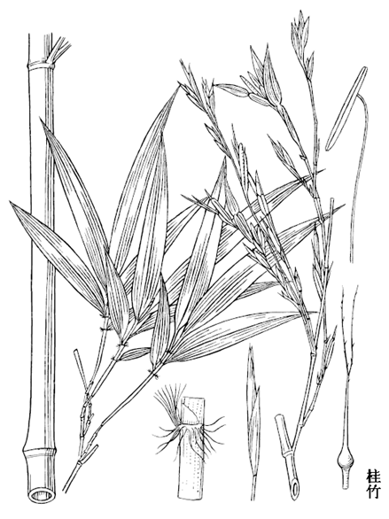桂竹的植株木质化,呈乔木状。地下茎(竹鞭)节晨长25-45mm,直径粗16-20mm,实心或中空,具芽一侧为深沟,微呈两侧压扁,每节除芽外,尚有小瘤状突起14-16个;芽单生,三角卵形,表面有光泽,长约1cm,中央有纵裂。竿高可达20m,粗达15cm,幼竿无毛;节间长达40cm,壁厚约5mm;竿环稍高于箨环;箨鞍革质,背面黄褐色,有时带绿色或紫色,有较密的紫褐色斑块与小斑点和脉纹,流生脱落性谈褐色刺毛;箨导小形或大形而呈镰状,紫褐色,繸毛通常生长良好;箨舌拱形,淡褐色或带绿色,边缘生有纤毛;箨片带状,中间绿色,两侧紫色,边缘黄色,平直或偶可在顶端微皱曲、外翻。末级小技具2-4叶;叶耳半圆形,繸毛发达,常呈放射状;叶舌明显伸出,拱形或有时截形;叶片长5.5-15cm,宽15-2.5cm。花枝呈穗状,长5-8cm,基部有3-5片逐渐增大的鳞片状苞片;佛焰苞6-8片,叶耳小形或近于无,繸毛通常存在,短。缩小叶圆卵形至线状披针形.基部收缩呈圆形,上端渐尖呈芒状,每片佛馅苞眼内具1校或有时:枚、稀可3枚的假小穗,推基部1-3片的苞胶内无假小穗而苞早落;小穗披针形,长2.5-3cm,含1或2(-3)朵小花;小穗轴呈针状延伸于最上孕性小花的内稃后方.其顶端常有不同程度的退化小花,节间均具细柔毛;颖1片或无;外种长2-2.5cm,被微毛,先端渐尖呈芒状;内停稍短于外稃,除2脊外,通常先端有微毛;鳞被菱状长椭圆形,长3.5-4mm,花药长11-14mm:花柱较长,柱头3,羽毛状。笋期5月下旬。
