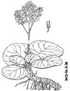 厚叶岩白菜为虎耳草科植物厚叶岩白菜的全草。它是多年生草本,5~50cm,无毛。根茎粗,横走,棕褐色,有鳞片和枯残托叶鞘。茎直立,无叶或具1个小叶。叶基生;叶柄长3~9cm,基部具托叶鞘;叶片质厚,近革质,有光泽,圆形或宽椭圆形,5~125cm,32~95cm,先端钝圆,基部通常楔形,稀浅心形,两面多具小腺窝,无毛,边缘具钝齿或不明显的细锯齿,叶脉明显。聚伞花序圆锥状顶生;35~13cm,多花;花梗长2~4mm;花萼钟状,5,裂片圆形;花瓣5,倒卵形,10~12mm,6~8mm,先端微凹,基部渐狭成爪,多脉,白色,或淡粉红色;雄蕊10;子房卵球形,半下位,花柱2,柱头头状。蒴果2裂。种子多数,平滑,15~2mm。花期5~7,果期9~10月。