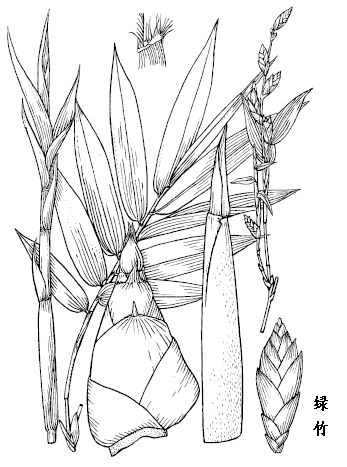 绿竹为植物木质化,呈乔木状。竿高6-12m,直径3-9cm。幼时被白粉,粉退后呈绿色或暗绿色;节间圆筒形,长20-35cm;竿壁厚4-12mm。箨鞘脱落性,无端近截形;箨耳近等大,椭圆形或近圆形,边缘生纤毛;箨舌高约1mm,近全缘或上缘呈波状;箨片直立,三角形,先端长渐尖,基部截形并向内民窄,其宽度约为箨鞘顶宽之半。分枝较高,常在竿第7节以上始发枝,竿每节有3主枝和若干较细小的枝条。末级小枝具6-15叶;叶鞘长7-15cm,幼时有小刺毛,边缘有时疏生纤毛;叶耳半圆形,边缘有棕色繸毛;叶舌矮,截平或圆拱起;叶片长圆状披针形,长15-30cm,宽3-6cm,先端长渐尖,基部钝圆或广楔形,下面被柔毛,边缘粗糙或有刺毛,次脉9-14对;叶柄长2-6mm。花枝无叶;假小穗单生或丛生于花枝各节,长2.7-3cm,宽7-10mm,两侧扁,下部绿色,上部赤紫色;苞片3-5,上方1或2片腋内发芽;小穗含5-9朵小花;颖1片,卵形,长9-10mm,边缘生纤毛,具多脉;外稃与颖相似,卵形,长17mm,先端有小尖头,具多脉,边缘具纤毛;内稃长13mm,先端尖锐而不具裂缺,背部两脊间有3-5脉,脊外至边缘各有2脉,边缘和脊上均生显著的纤毛;鳞被3,近同形,卵状披针形,长3.5mm,边缘生纤毛;花药长8mm,顶头有小尖头;子房卵形,长2mm,被粗毛,花柱显著较子房为长,先端有3条长而纤细的羽毛状柱头。笋期5-11月,花期夏、秋季。 |