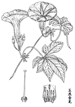 五爪金龙是多年生缠绕草本。全株无毛。老时具块根。茎细长,有细棱,有时有小疣状突起。叶互生;叶柄长2-8cm;基部具假托叶;叶片掌状5深裂或全裂,裂片卵状披针形、卵形或椭圆形,中裂片较大,长4-5cm,宽2-2.5cm,两侧裂片稍小,先端渐尖或稍钝,具小短尖头,基部楔形渐狭,全缘或不规则微波状,基部1对裂片通常再2裂。聚伞花序腋生,具1-3朵花,或偶有3朵以上;苞片及小苞片均鳞片状,早落;萼片5,稍不等长;花冠紫色或淡红色,偶有白色,漏斗状,长5-7cm;雄蕊5,不等长,花丝基部稍扩大,被毛;子房无毛,花柱纤细,长于雄蕊,柱头2球形。葫果近球形,2室,4瓣裂。种子黑色,边缘被褐色柔毛。花、果期夏、秋季。