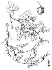 2.马兜铃为草质藤本。根圆柱形。茎柔弱,无毛。叶互生;叶柄长1-2cm,柔弱;叶片卵状三角形、长圆状卵形或戟形,长3-6cm,基部宽1.5-3.5cm,先端钝圆或短渐尖,基部心形,两侧裂片圆形,下垂或稍扩展;基出脉5-7条,各级叶脉在两面均明显。花单生或2朵聚生于叶腋;花梗长1-1.5cm;小苞片三角形,易脱落;花被长3-5.5cm,基部膨大呈球形,向上收狭成一长管,管口扩大成漏斗状,黄绿色,口部有紫斑,内面有腺体状毛;檐部一侧极短,另一侧渐延伸成舌片;舌片卵状披针形,顶端钝;花药贴生于合蕊柱近基部;子房圆柱形,6棱;合蕊柱先端6裂,稍具乳头状凸起,裂片先端钝,向下延伸形成波状圆环。蒴果近球形,先端圆形而微凹,具6棱,成熟时由基部向上沿室间6瓣开裂;果梗长2.5-5cm,常撕裂成6条。种子扁平,钝三角形,边缘具白色膜质宽翅。花期7-8月,果期9-10月。