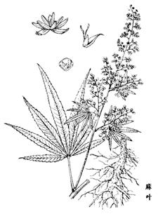 大麻是一年生草本,高l-3m。茎直立,表面有纵沟,密被短柔毛,皮层富纤维,基部木质化。掌状叶互生或下部对生,全裂,裂片3-11枚,披针形至条状披针形,两端渐尖,边缘具粗锯齿,上面深绿色,有粗毛,下面密被灰白色毡毛;叶柄长4-15cm,被短绵毛;托叶小,离生,披针形。花单性,雌雄异株;雄花序为疏散的圆锥花序,顶生或腋生;雄花具花被片5,雄蕊5,花丝细长,花药大;雌花簇生于叶腋,绿黄色,每朵花外面有一卵形苞片,花被小膜质,雌蕊1;于房圆球形,花柱呈二歧。瘦果卵圆形,长4-5mm,质硬,灰褐色,有细网状纹,为宿存的黄褐色苞片所包裹。花期5- 6月,果期7-8月。