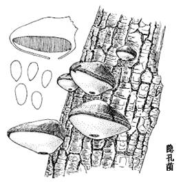隐孔菌是子实体无柄或有柄状基部,球形至扁半球形,(1.5-6)cm×(2-5)cm。盖面平滑,有粉褐色至淡红褐色的皮壳,具油漆光泽,无环纹;盖缘钝圆,淡色,向腹面扩展与菌幕相连。菌幕白色至淡粉红色,初期将菌管全部覆盖,孢子成熟时在近基部开一小孔,直径2-4mm。菌肉白色至淡色,软木栓质,厚约2-8mm。菌管单层,长2-5mm;管口圆形至多角形,每1mm间4-5个;管口面初期白色,渐呈淡黄褐色至淡褐色。孢子椭圆形至长椭圆形,有喙,光滑,无色,(10-13)μm×(4-6)μm。