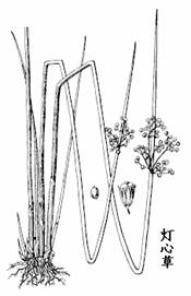 灯心草是多年生草本,高40-100cm。根茎横走,密生须根。茎簇生,直立,细柱形,直径1.5-4mm,内充满乳白色髓,占茎的大部分。叶鞘红褐色或淡黄色,长者达15cm;叶片退化呈刺芒状。花序假侧生,聚伞状,多花,密集或疏散;与茎贯连的苞片长5-20cm;花淡绿色,具短柄,长2-2.5mm;花被片6,条状披针形,排列为2轮,外轮稍长,边缘膜质,背面被柔毛;雄蕊3或极少为6,长约为花被的2/3,花药稍短于花丝;雌蕊1,子房上位,3室,花柱很短,柱头3。蒴果长圆状,先端钝或微凹,长约与花被等长或稍长,内有3个完整的隔膜。种子多数,卵状长圆形,褐色,长约0.4mm。花期6-7月,果期7-10月。