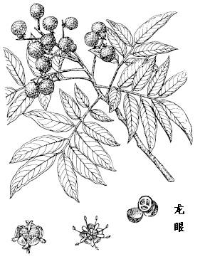龙眼是常绿乔木,高通常10m左右。具板根。小枝粗壮,被微柔毛,散生苍白色皮孔。偶数羽状复叶,互生;叶连柄长15-30cm,或更长;小叶4-5对,很少3或6对,小叶柄长通常不超过5mm;叶片薄革质,长圆状椭圆形至长圆状披针形,两侧常不对称,长6-15cm,宽2.5-5cm,先端渐尖,有时稍钝头,上面深绿色,有光泽,下面粉绿色,两面无毛。花序大型,多分枝,顶生和近枝腋生,密被星状毛;花梗短;萼片近革质,三角状卵形,长约2.5mm,两面均被黄褐色绒毛和成束的星状毛;萼片、花瓣各5,花瓣乳白色,披针形,与萼片近等长,仅外面被微柔毛;雄蕊8,花丝被短硬毛。果近球形,核果状,不开裂,直径1.2-2.5cm,通常黄褐色或有时灰黄色,外面稍粗糙,或少有微凸的小瘤体;种子茶褐色,光亮,全部被肉质的假种皮包裹。花期3-4月,果期7-9月。