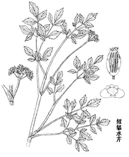 短辐水芹是多年生草本,高20-60cm。全株光滑无毛。茎自基部分枝,具棱。叶片轮廓三角形,一至二回羽状分裂,末回裂片卵形至菱状披针形,长1-2cm,宽约0.5cm,先端渐尖,基部楔形,边缘有钝齿。复伞形花序顶生或侧生,花序梗长1-2cm;无总苞片,伞辐4-10;小总苞片披针形,多数;小伞形花序有花10余朵;萼齿线状披针形;花瓣白色,倒卵形;花柱基圆锥形,花柱直立或叉开。双悬果椭圆形或长圆形,长2-3mm,宽1-1.5mm,侧棱较背棱和中棱隆起,木栓质,分生果横剖面半圆形,棱槽内有油管1,合生面油管2。花期5月,果期5-6月。