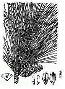 6.云南松属乔木,高达30cm,胸围1m。树皮灰褐色,不规则鳞片状深裂,易脱落。一年生枝粗壮,红褐色,二三年生小枝上苞片状鳞叶易脱落,露出褐色内皮;冬芽圆锥状卵形,红褐色,芽鳞披针形,先散开,有白色丝状毛。针叶3针一束,稀2针一束,长10-30cm,径约1.2mm,柔软,稍下垂,横切面扇状三角形,树脂道4-5个,中生与边生并存,叶鞘宿存。球果圆锥状卵圆形,长5-11cm,梗长约5mm,熟时栗褐色或黄褐色;鳞盾肥厚隆起,有横脊;鳞脐微凹或微隆起,有短刺。种子近卵圆状倒卵形,边翅长1.6-1.9cm。花期4-5月,果熟期翌年10-11月。