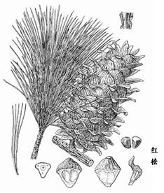 7.红松是乔木,高50m,胸围1m。幼树皮灰褐色,大树皮灰褐色或灰色,不规则鳞片状纵,脱后露出红褐色内皮。一年生枝密生黄褐色柔毛;冬芽淡红褐色,长圆状卵形,先端尖。针叶5针一束,长6-12cm,粗硬,直,边缘有锯齿,背面通常无气孔线,腹面每侧有6-8条气孔线,横切面近三角形,内见3个树脂道,中生,叶鞘早落。雄球花椭圆状圆柱形,红黄色,长7-10mm,密集新枝下部成穗状;雌球花绿褐色,圆柱状卵圆形,直立,单生或数个集生。球果圆锥状卵圆形、圆锥状长卵圆形或卵状长圆形,长9-14cm,径6-8cm,梗长1.5cm,熟后种鳞张开;种鳞菱形先端钝,向外反曲,鳞盾黄褐色,三角形或斜方状三角形,外面有皱纹,鳞脐不显著。种子大,暗紫褐色或褐色,倒卵状三角形,微扁,长1.2-1.6cn。花期6月,果熟期翌年9-10月。
