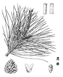 4.黑松属乔木,高达30m,胸围可达2m。幼树皮暗灰色,老时灰黑色,粗厚,不规则块裂。一年生枝淡褐黄色,无毛;冬芽银白色,圆柱状椭圆形或圆柱形,顶尖,芽鳞披针形,边缘白色丝状。针叶2针一束,深绿色,有光泽,粗硬,长6-12cm,边缘有细锯齿,两面均有气孔线,横切面有树脂道6-11个,中生。雄球花淡红褐色,圆柱形,长1.5-2cm;雌球花单生或2-3个聚生新枝近顶端,直立,卵圆形,淡紫红色。球果熟时褐色,圆锥状卵圆形或卵圆形,长4-6cm,径3-4cm,有短梗,向下弯垂,中部种鳞卵状椭圆形,鳞盾稍肥厚,横脊显著,鳞脐有短刺。种子倒卵状椭圆形,长5-7mm,连翅长1.5-1.8cm,种翅灰褐色。花期4-5月,果熟期翌年10月。